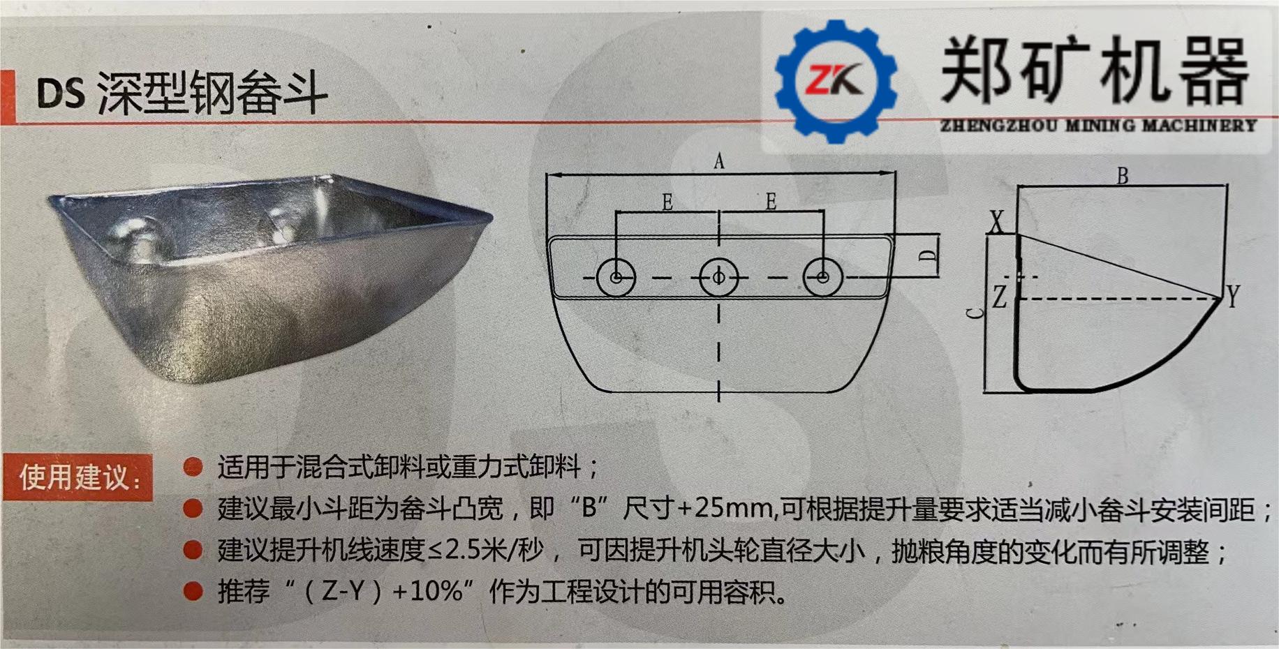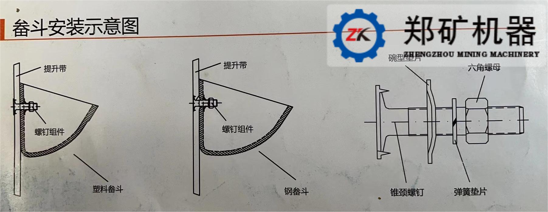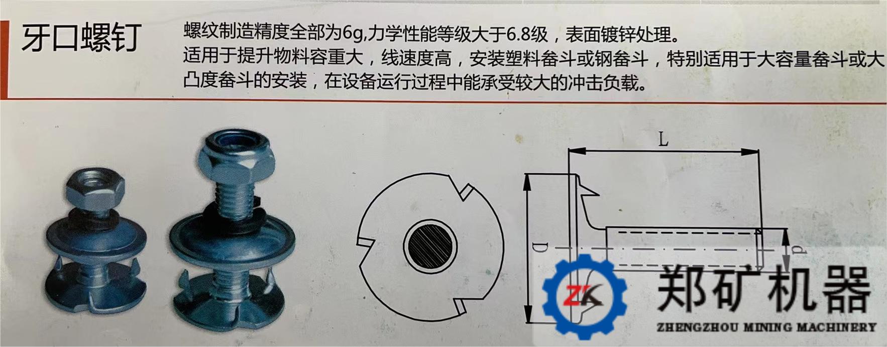 TD型膠帶式提升機(jī)采用膠帶作為料斗的牽引部件。料斗用具有特殊頭部的螺釘(牙口螺釘)固定在帶子上,為了使螺栓的頭部不妨礙膠帶通過滾筒,在料斗的后壁上制有相應(yīng)的凹槽。膠帶的寬度要根據(jù)膠帶的標(biāo)準(zhǔn)選取,帶寬應(yīng)比料斗的寬度在30-40mm。帶的帆布層數(shù)應(yīng)根據(jù)帶子所受的最大牽引力計算確定(通常不少于4層),計算方法同帶式輸送機(jī),但由于膠帶上鉆了連接料斗的孔,降低了膠帶的強度,所以應(yīng)比膠帶輸送機(jī)驗算膠帶強度的安全系數(shù)增大10%左右。