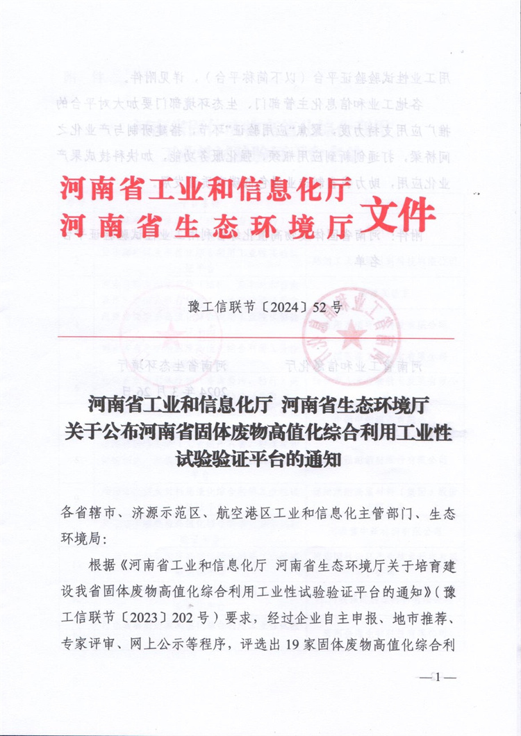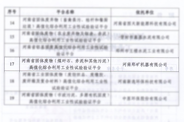 恭喜河南鄭礦機(jī)器有限公司被河南省工業(yè)和信息化廳、河南省生態(tài)環(huán)境廳評(píng)定為河南省固體廢物高值化綜合利用工業(yè)性試驗(yàn)驗(yàn)證平臺(tái)的。