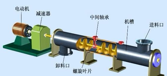 螺旋輸送機(jī)由聯(lián)軸器、進(jìn)、出料口、主軸裝置、軸承座裝配、中間軸承、底架裝配、支腿及驅(qū)動等組成。螺旋輸送機(jī)本體由螺旋葉片、槽體、主軸裝置裝配而成。驅(qū)動裝置為電機(jī)、減速機(jī)。